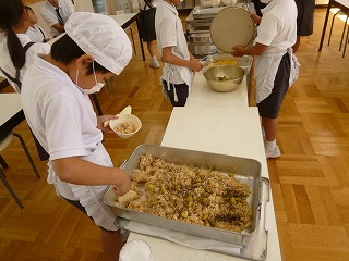 1年生が多くて、盛り切れずに苦労していた給食を