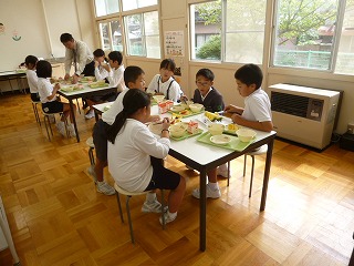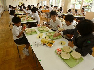 ランチルームで食べている3年生と6年生は