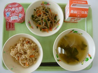 ツナごはん、みそ汁、五目きんぴら、ヨーグルト、牛乳です。