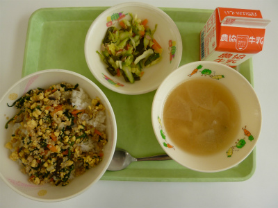 3色そぼろごはん、みそ汁、茎わかめとアスパラのソテー、牛乳です。