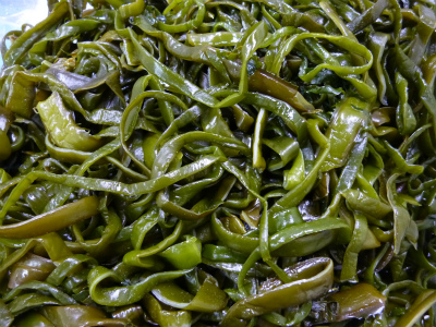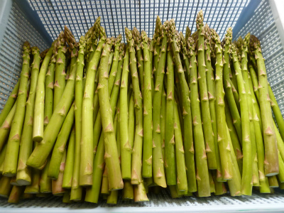 太くて瑞々しい立派なアスパラと、コリコリ食感のおいしい茎わかめです。