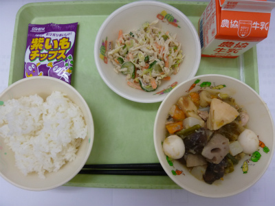 ごはん、含め煮、かみかみサラダ、紫芋チップス、牛乳です。