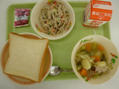 食パン、スープ煮、ごぼうサラダ、豆チョコクリーム、牛乳です。