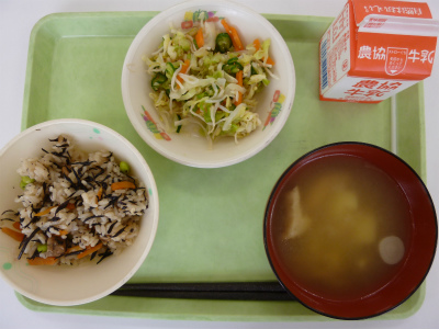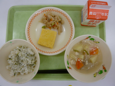 菜めし、みそけんちん汁、卵焼き、切り干しの煮物、牛乳です。