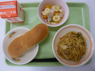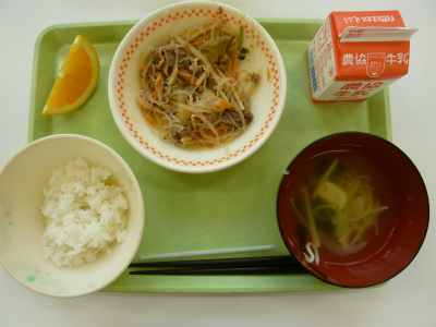 ごはん、チャプチェ、わかめスープ、フルーツ、牛乳です。