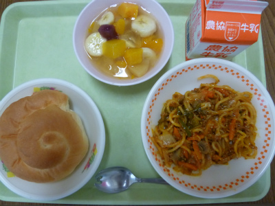 ミルクロール、スパゲティーソテー、ミックスゼリーです。
