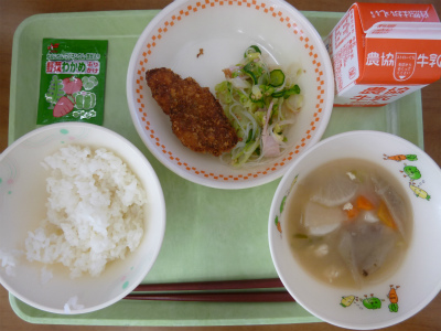 ごはん、タラフライ、中華あえ、みそけんちん汁、ふりかけ、牛乳です。