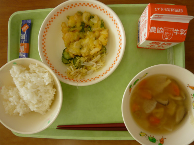 ごはん、エビといか入りかき揚げ、そうめんカボチャのごま酢あえ、みそ汁、