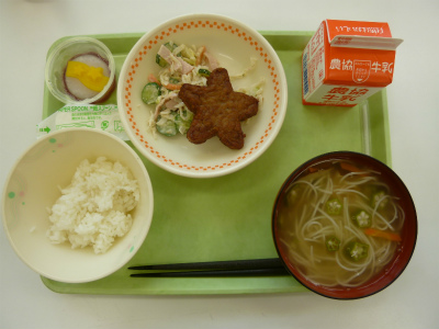 ごはん、星のハンバーグ、ごまマヨネーズ和え、七夕そうめん汁、七夕ゼリー、牛乳です。