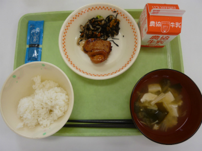 散らし寿司、すまし汁、鶏のバーベキューソース焼き、牛乳でした。