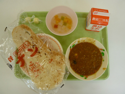 1学期最後の給食は、ナン、キーマカレー、フルーツポンチ
