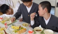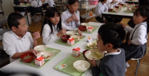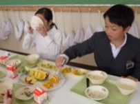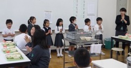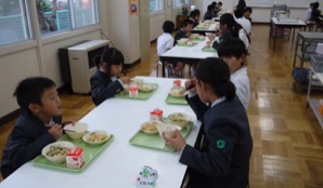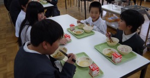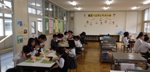 他の学年と向かい合って少しおしゃべりを楽しみながらの給食も