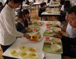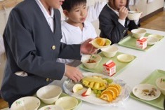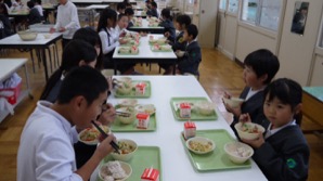 今日はランチルームで給食を食べている1年2組と5年2組にテーブルに