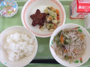 給食は七夕にちなんで、星型のハンバーグ、そうめん汁、七夕デザートに