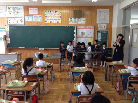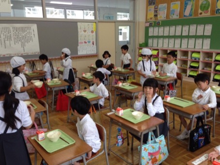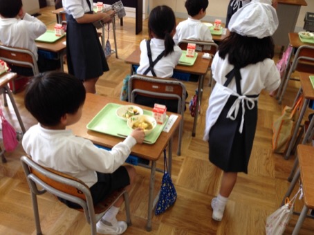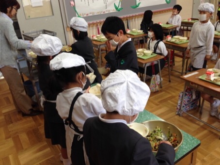 昨日から自分たちで給食当番をしました。みんなしっかりとエプロン、ぼうし、マスクをして一生懸命に当番の仕事をがんばりました。