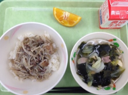 2015年5月13日 13時18分給食の牛丼には肉だけではなく、えのきや糸こんにゃく、車麩などが入り、