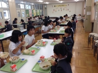 1年生と6年生、2年生と4年生、3年生と5年生が 一週間交代でいっしょに給食を食べます。最初の方は、少し緊張して食べている様子でしたが、慣れてくると会話を楽しみながら食べていました。