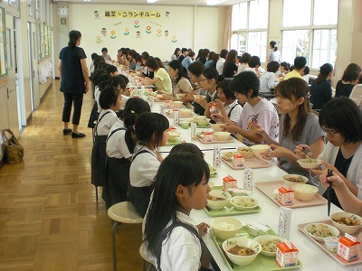 親子で楽しく、みんないい顔で給食を食べていました。