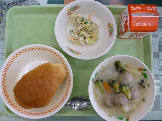バターロール ミートボールのクリーム煮 シーチキンサラダ 牛乳