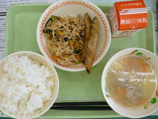 ごはん ししゃもフライ 切り干しのピリ辛炒め 味噌けんちん汁