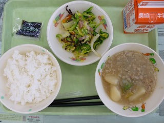 ごはん ジャガイモのそぼろ煮 中華和え ひじきのり 牛乳