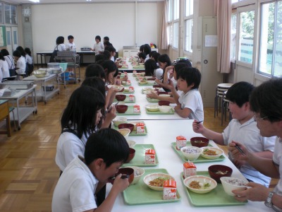 普段の給食は、各学級ごとに教室で食べているのですが、今週から異学級や担任以外の先生との交流や食事のマナーの育成を目的に、一週間交替でランチルームを使用し、一緒に給食を食べています。