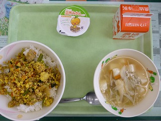 そぼろごはん!? 千切りスープ ミカンゼリー 牛乳