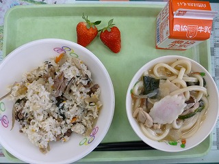 今日の給食は,穀類+穀類=満腹メニュー でした。