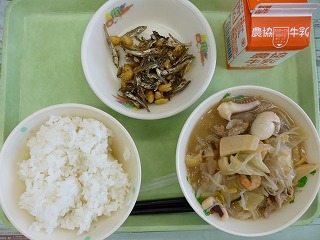 ごはん 八宝菜 小魚揚げ煮 牛乳