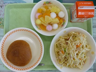 胚芽パン 竹の子のクリームパスタ フルーツ白玉 牛乳