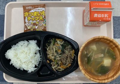 ビビンバ,中華スープ,さつまいもチップス,牛乳
