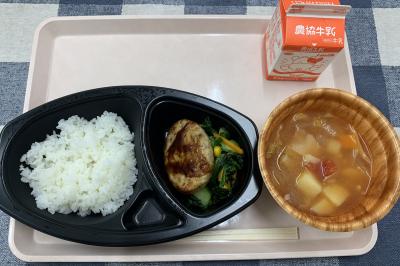 ごはん,ハンバーグ,ほうれん草のサラダ,ミネストローネ,牛乳