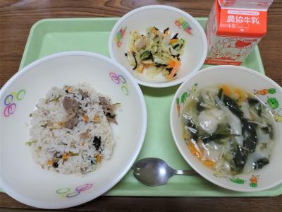 今日も、オイスターソースのコクがきいた具を1クラス分ずつ調理員さんがご飯にむらなく混ぜこんでくれました。