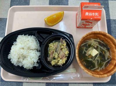 親子丼,わかめスープ,オレンジ,牛乳