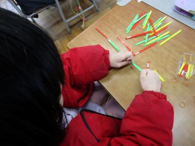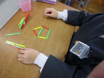 1年生は、算数で「形」を学んでいました。算数セットで三角形や四角形を作りながら、特徴を考えていました。