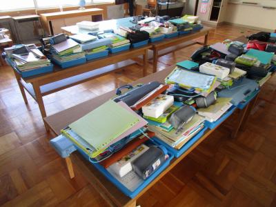 散らばっていた一人ひとりの教科書やノート、ドリル、ピアニカ等は、先生たちで整理しています。もうすぐで完了します。いつでも鳳至の子に渡して、使うことができるように準備しています。