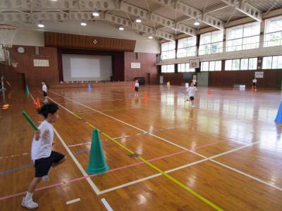 5・6年生と今井選手は、まず車いすラグビーを体験しました。