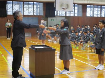 緊張しながらも、姿勢よく、校長先生から表彰状や、任命書をもらう鳳至の子でした。
