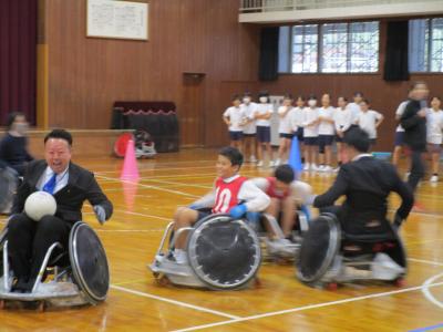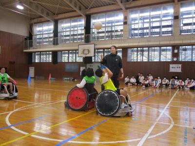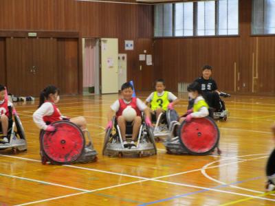 5年生対6年生で、車いすラグビーのゲームにも挑戦!
