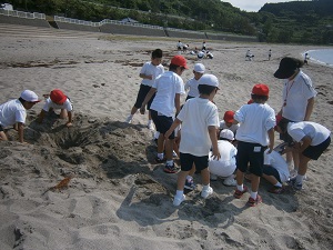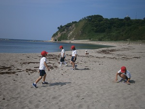 子どもたちは、砂浜を走ったり、貝殻を拾ったりと思い思いに楽しんでいました。