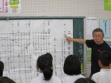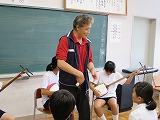 2015年6月26日 14時05分三夜踊りのお囃子の練習が今日から始まりました。中室さんをはじめ7名の三夜保存会の方々が教えに来て下さいます。4年生から6年生までが、三味線、歌、太鼓、笛に別れ本番に向けての練習です。今日を入れて昼休みに6回の練習になります。