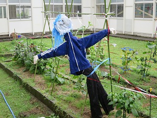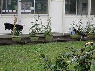 久しぶりの大きな雨となりました。学校の中庭には、1年生と2年生が生活科で世話をしている菜園があります。そこに子どもたちが作った案山子が登場しました。今日はあいにくの雨になりましたが、作物にとってはめぐみの雨です。きっとこの案山子が作物にめぐみをもたらせてくれたのでしょう。