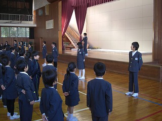 はじめに今月の歌を全員で歌いました。今回は、いつもと違い、集会委員会が前に出て、大きな声で歌いました。