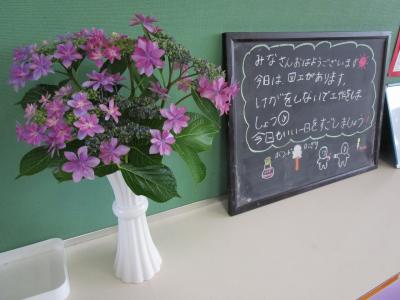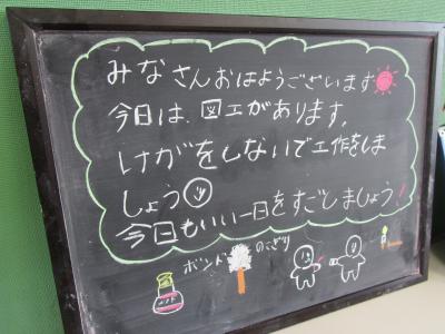 クラスメイトへ,図画工作でケガをしないように学習すること,そして今日もいい1日をすごしていこうと呼びかける,あたたかなメッセージが書かれていました。隣には,花が飾られ,「言葉に花(華)をそえる」ですね。