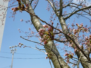 通勤途中の桜の木々に,チラホラと淡いピンク色が見えるようになりました。いよいよ輪島でも桜の開花が始まりました。  校庭の桜もご覧の通り!!  つぼみが大きく膨らみ,その先が桜色に染まっています