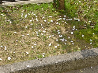 ところで,ようやく開いた桜の花が,ちぎられたように花ごと散りばめられていました。小さな花の首元から切られている状態でした。