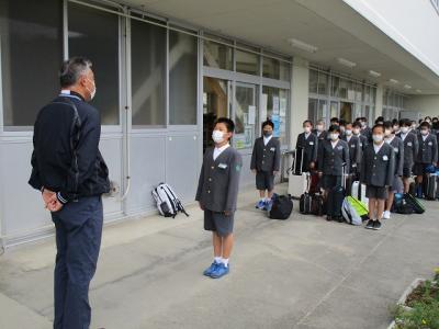 6年生代表が校長先生に,宿泊体験学習を通して,どのように成長したいかを述べ,鳳至小学校の最上級生としての自覚をもって出発しました。出発の際には,校舎から6年生に「行ってらっしゃい。」と手をふる5年生の姿も見えました。