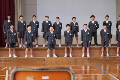 全校集会では各委員会委員長の目標や,各学年で後期にがんばっていきたいことを伝えた後,5年生の合唱が披露されました。この日の11:00~11:45に河井小学校の5年生と合唱交流会も開催されました。