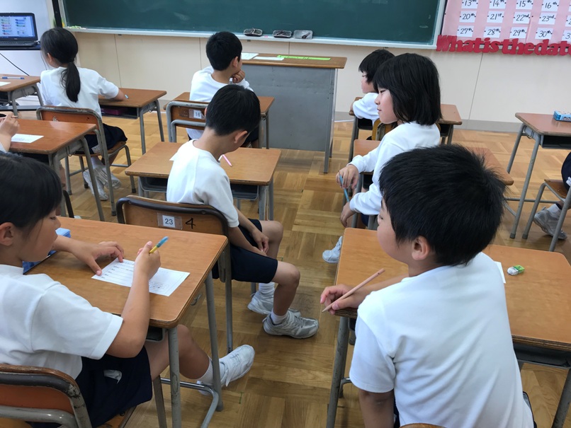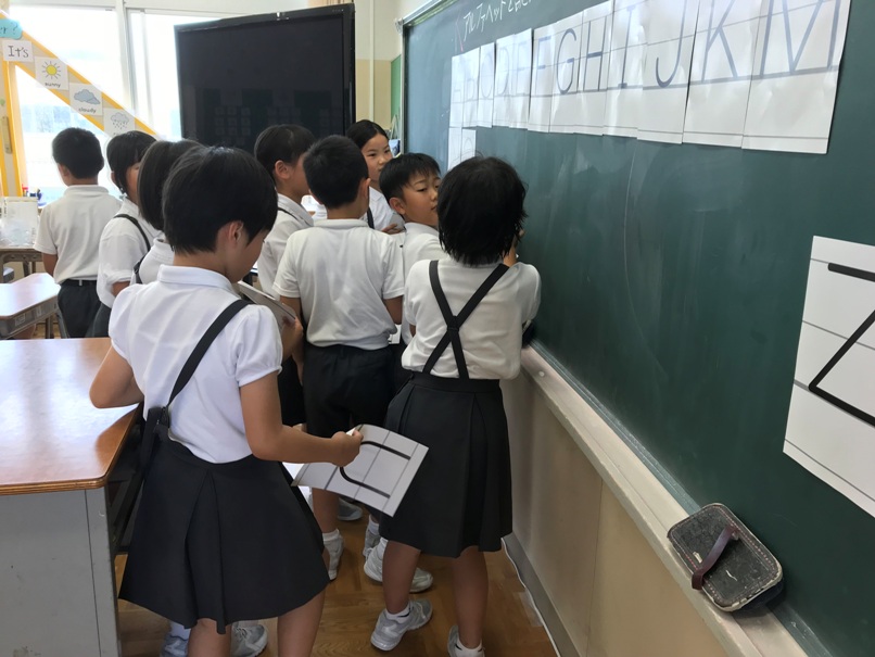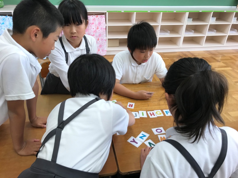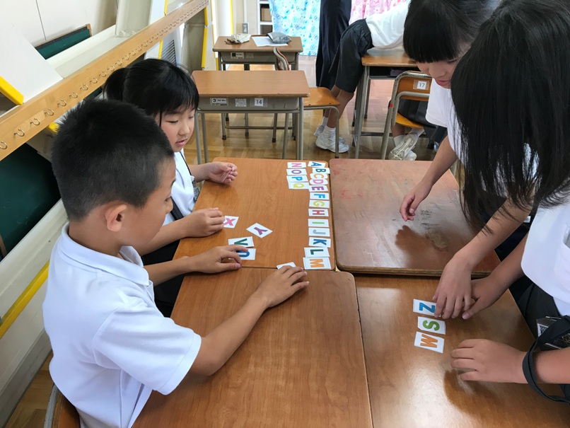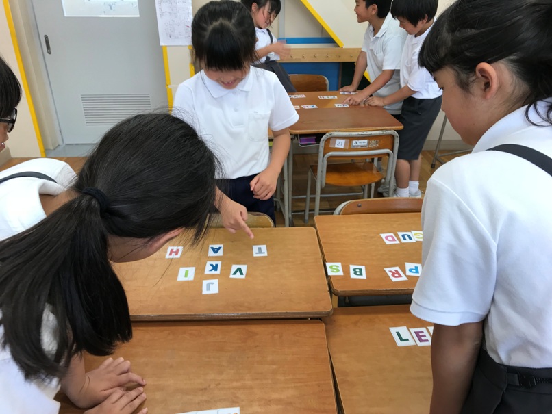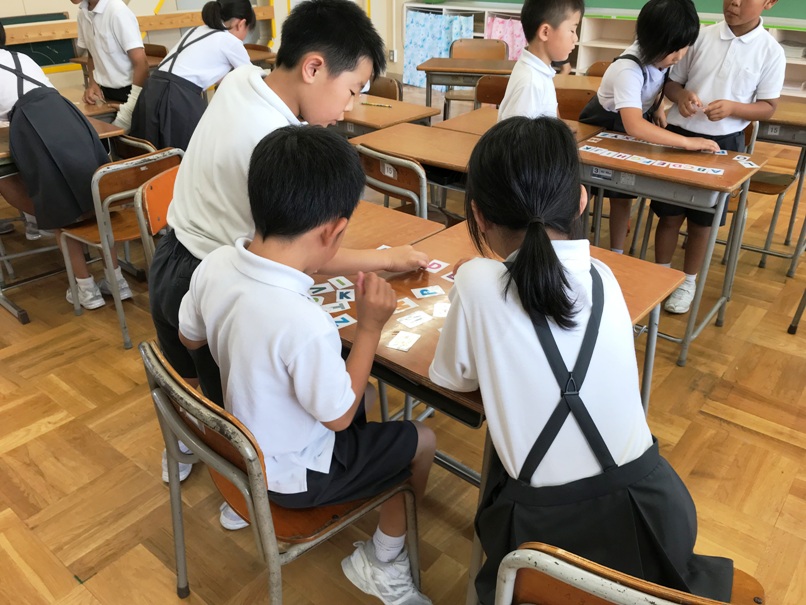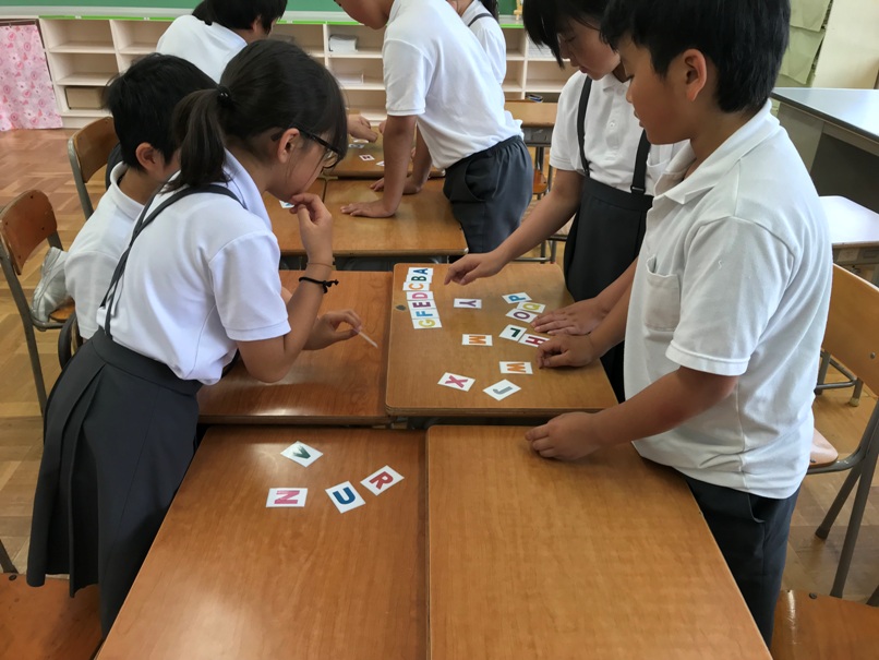 4年生では今ALPHABETの学習をしています。カルタゲームや並べ替えゲーム,ジェスチャーゲームを通してどんどん覚えていきました。今回は,なかま分けゲームに挑戦しました。グループでアルファベットの形に着目し,なかま分けしました。その後,分けたグループについて他のグループの人に紹介しました。「同じや!」「確かに!」と認め合いながら交流できていました。