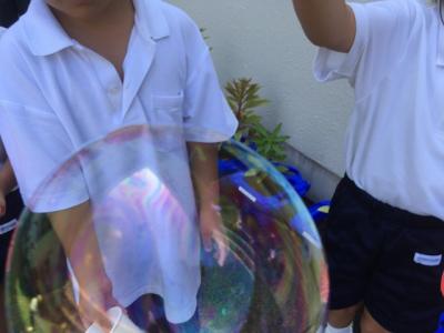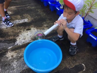 生活科でシャボン玉遊びをしました。数人の子は初体験です。